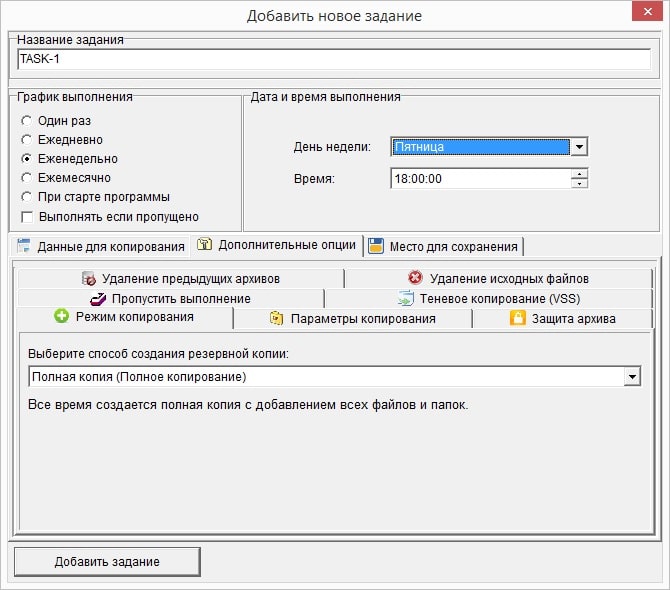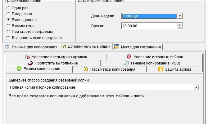 - Тип резервного копирования — полное, инкрементальное, дифференциальное.